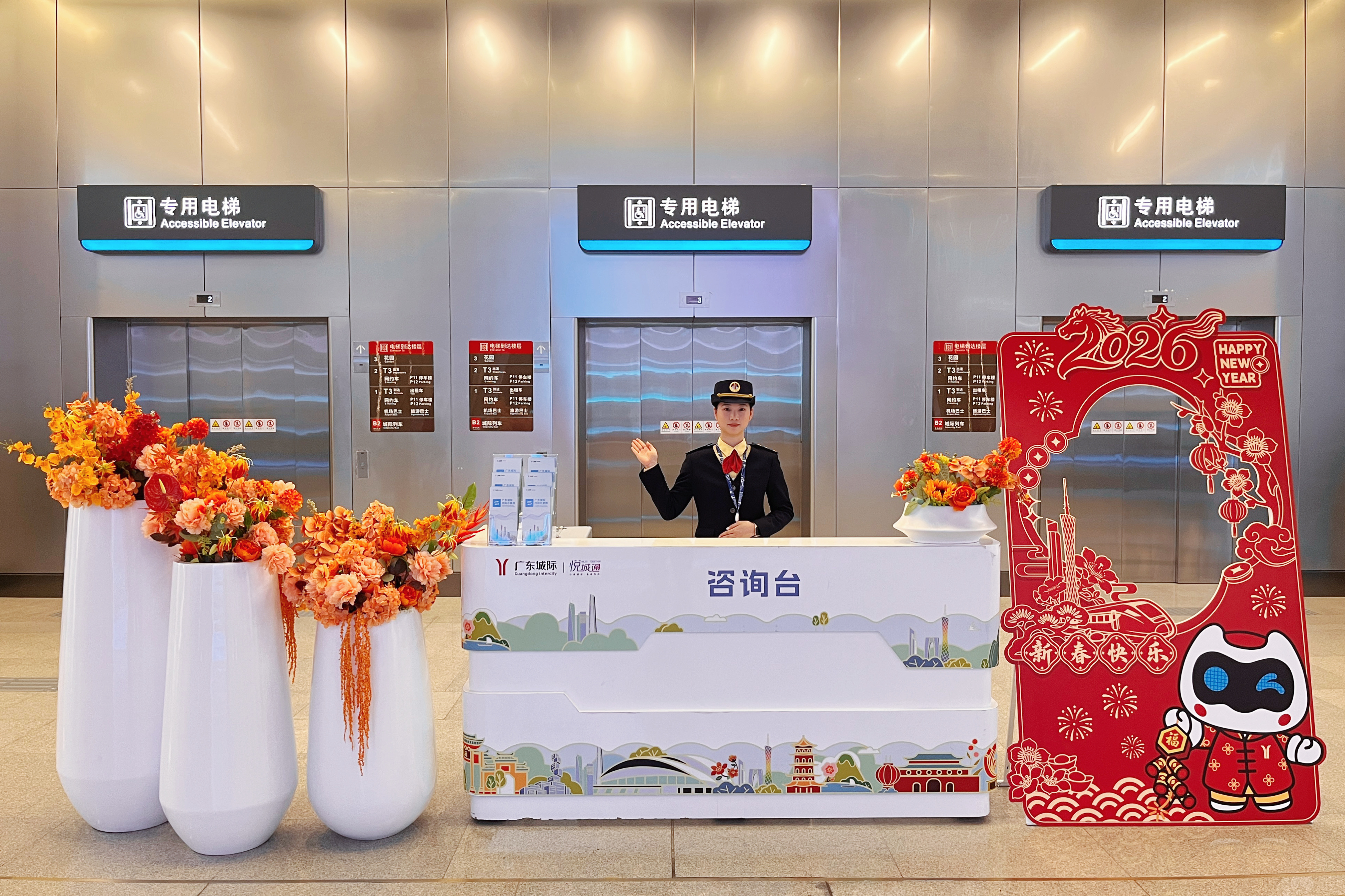 广东城际在强化运输保障的同时,推出系列春运暖心服务,营造温馨出行氛围。广东城际将在线网各车站张贴马年主题春联与“YOYO”窗花,营造喜庆祥和的节日氛围。同时在番禺、花都、琶洲、白云机场东站等设立“春运服务驿站”,提供爱心药箱、便民雨具、行李协助及引导服务;在肇庆、佛山西、惠州北、广州白云站等枢纽设置流动咨询岗,方便旅客出行。